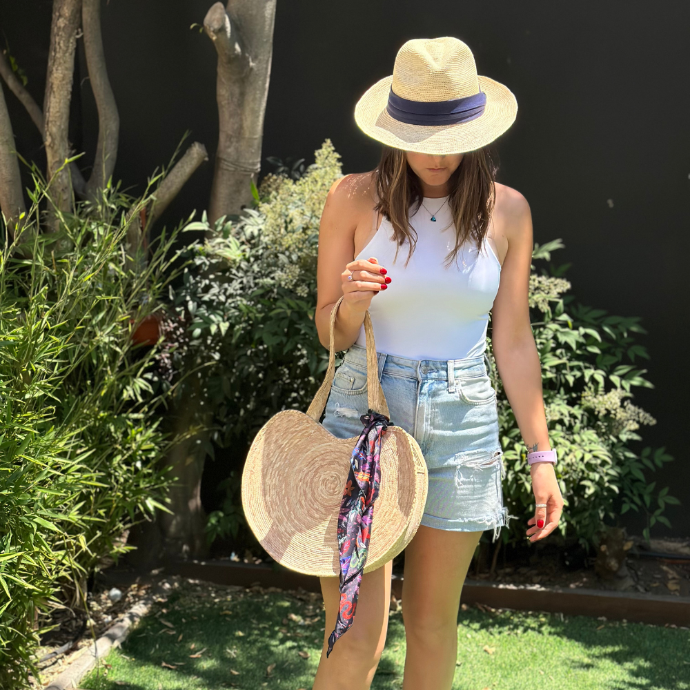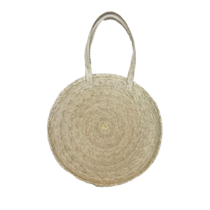 Bolso circular de palma natural, elaborado a mano por artesanos mexicanos.